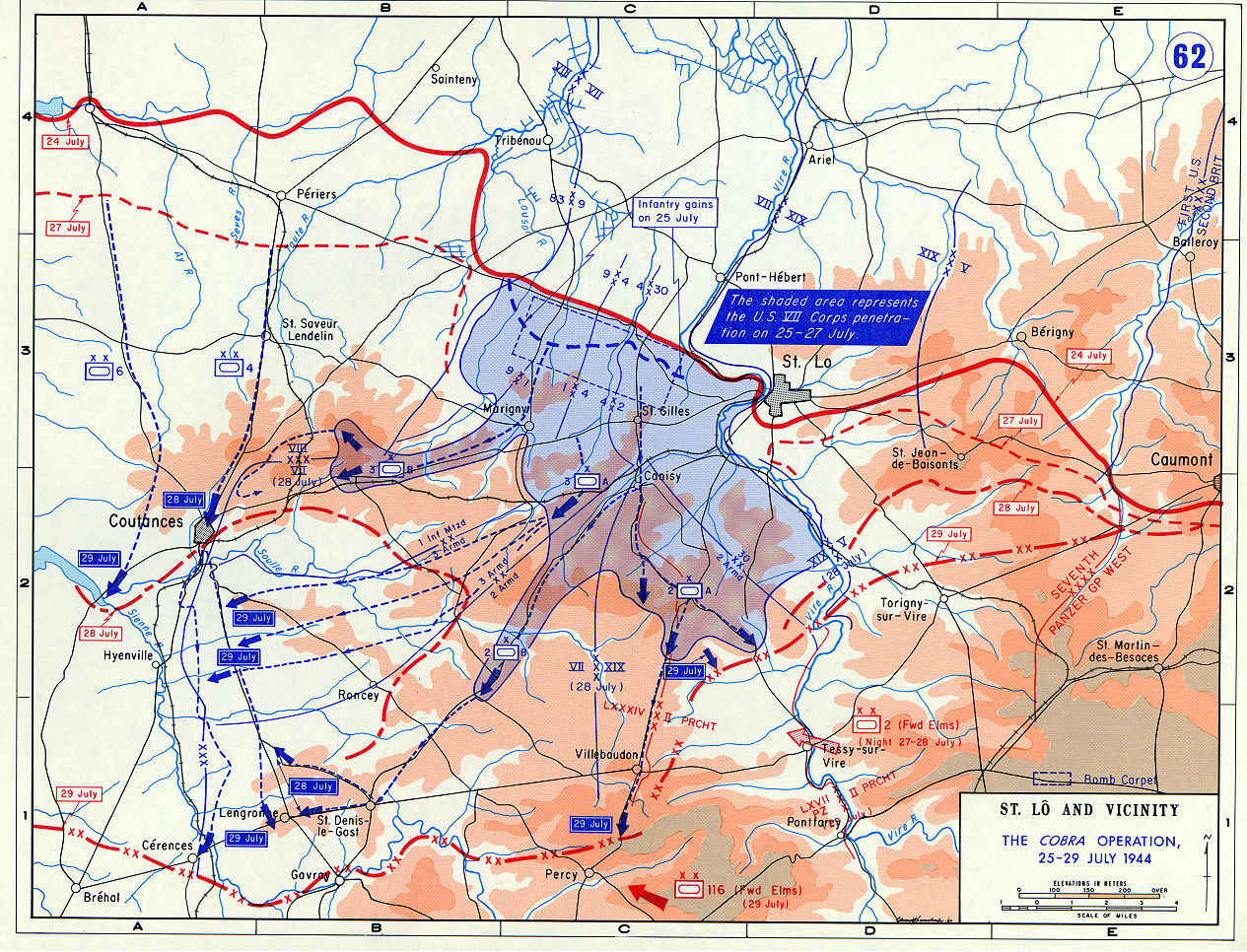 Massive carpet bombing by Allied aircraft opens a hole in the German lines, beginning the breakout from Normandy